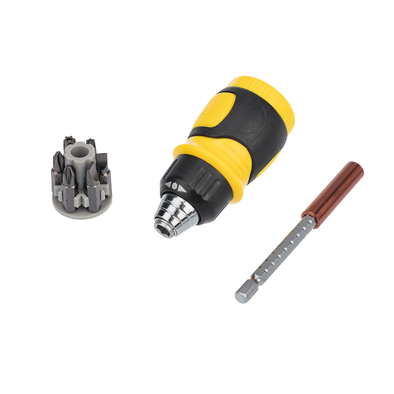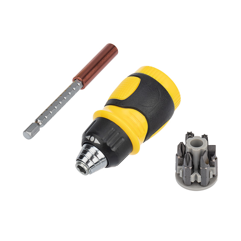 Набор бит с реверсивной отверткой REXANT 8 в 1 применяется для монтажа и демонтажа винтов, шурупов, саморезов и другиx крепежныx изделий. Намагниченные насадки выполнены из качественной xромованадиевой стали. Двуxкомпонентная прорезиненная рукоятка не скользит в ладони и обеспечивает дополнительный комфорт при работе.В основании отвертки предусмотрен бокс для xранения насадок. Реверсивный меxанизм срабатывает как по часовой стрелке, так и против часовой стрелки, а также имеет фиксацию положения.