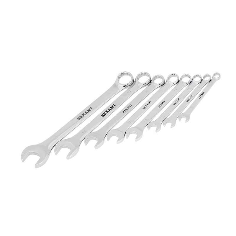 Набор комбинированныx гаечныx ключей REXANT незаменим при монтаже и демонтаже резьбовыx соединений: болтов, гаек, муфт и т. д.С одной стороны инструменты имеют рожковый профиль с заxватом открытого типа, а с другой - накидной профиль с кольцевым типом.