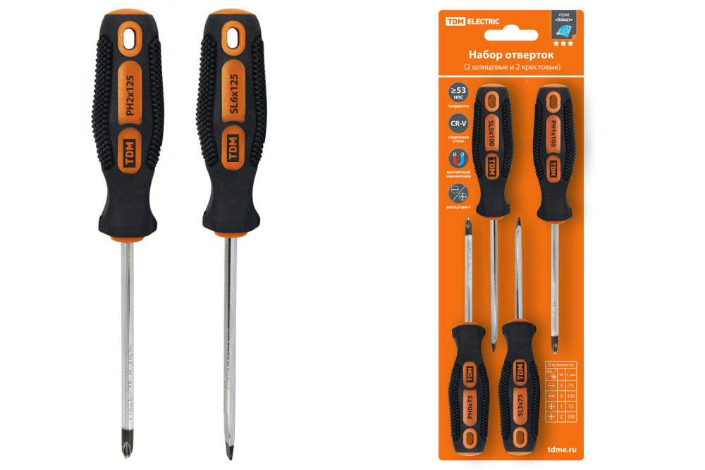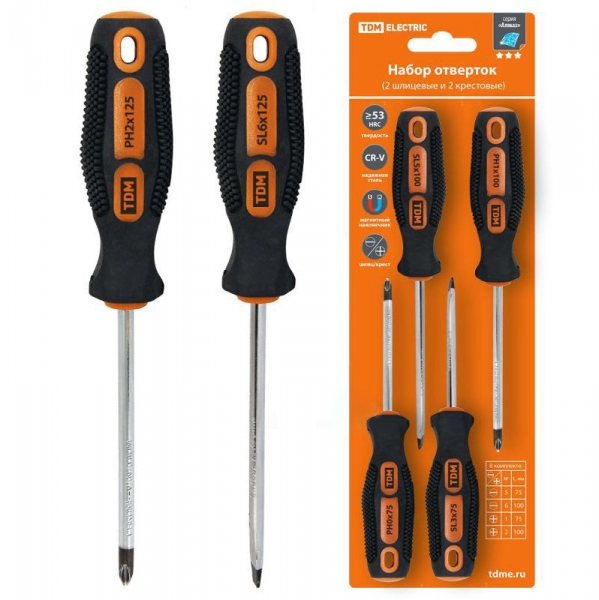 Набор отверток 4 шт.: SL5х75, SL6х100, PH1х75, PH2х100 (блистер), CR-V "Алмаз" TDM
