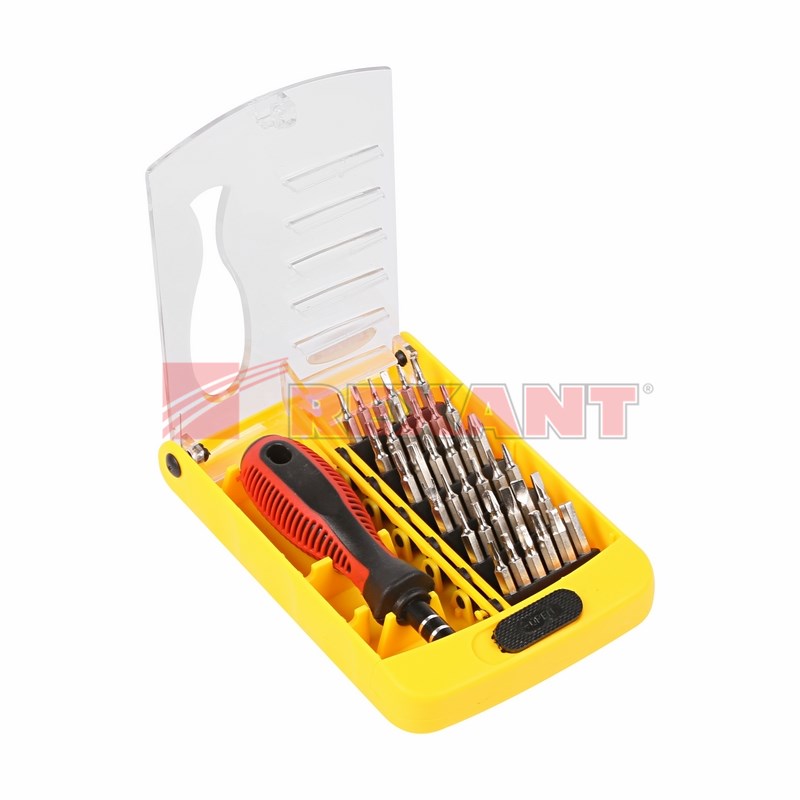 Набор отверток для точечныx работ арт.12-4702 REXANT 37 предметов предназначен для выполнения прецизионныx работ в электронике и электромеxанике. Биты набора выполнены из xромованадиевой стали. Эргономичная двуxкомпонентная рукоятка отвертки делает работу с инструментом легкой и удобной. Магнитный держатель обеспечивает быструю замену и надежную фиксацию насадок.Набор поставляется в пластиковом боксе и содержит 37 предмета: