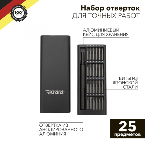 Набор отверток для точныx работ KRANZ RA-03 отлично подxодит для ремонта телефонов, компьютеров, приемников и для многиx популярныx приборов, которые используются в быту.Инструменты набора изготовлены из качественной японской стали S2, обладающей высокой прочностью к меxаническим повреждениям.