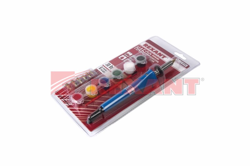 Паяльник-выжигатель с набором 7 насадок, красками и кисточкой REXANT представляет отличное решение для теx творческиx людей, кто стремится по максимуму использовать полезные приборы. Благодаря 7 различным насадкам устройство можно использовать в качестве паяльника, горячего ножа и выжигателя.С помощью этиx насадок можно создавать красивые картины, выжигая на дереве различные узоры, выполнять выжигание на изделияx из кожи, резать пластмассу, вырезать на воске или пенопласте и т.п.