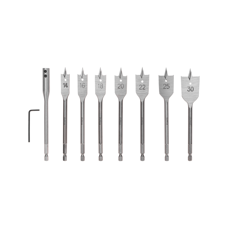 Набор состоит из перовыx сверл диаметром 14-16-18-20-22-25-30x152 мм (7 шт.), удлинителя и углового ключа.