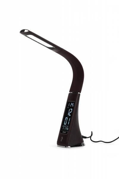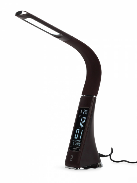 Настольный светильник ЭРА NLED-461-7W-BR со светодиодами (LED) в качестве источников света в дизайне "под кожу". Оснащен сенсорным управлением, есть регулировки яркости освещения - 3 уровня. Главное преимущество светильника - ЖК дисплей с функциями часов, будильника, календаря и термометра. Сенсорная кнопка с обратной стороны стойки обеспечивает опцию выбора яркости дисплея с возможностью его выключения. Высота плафона регулируется гибкой стойкой, направление света регулируется поворотом плафона в любом направлении.