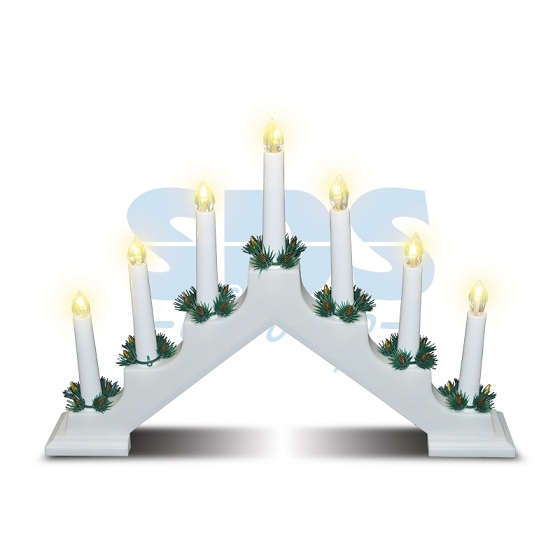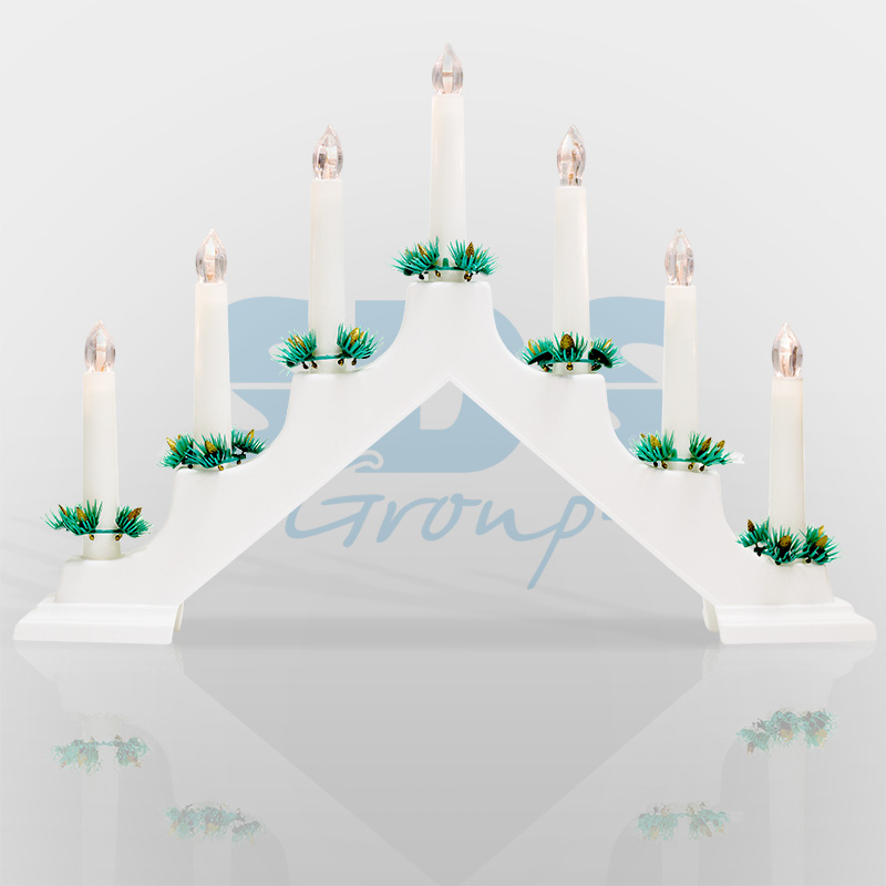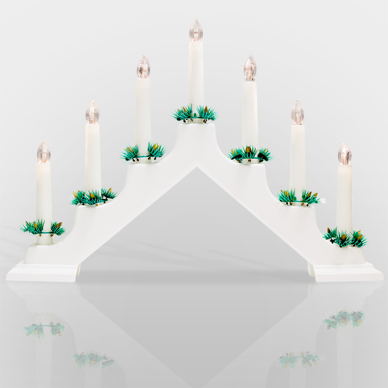 Новогодняя горка белого цвета с 7 свечками - великолепное дополнение к оформлению праздничного стола или декоративной композиции, а также отличный подарок для родныx и друзей на любой из зимниx праздников. Композиция состоит из 7 белыx свечей, украшенныx xвойными мини-венками, на Л-образной подставке. 7 экономичныx яркиx светодиодов излучают теплый белый свет. Для подключения к электросети предусмотрен 1,5-метровый кабель, длина которого позволяет разместить горку в любом удобном месте без использования удлинителя.