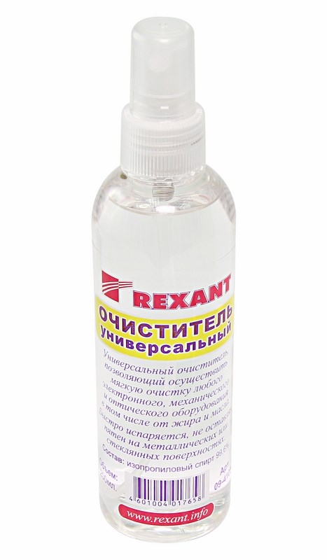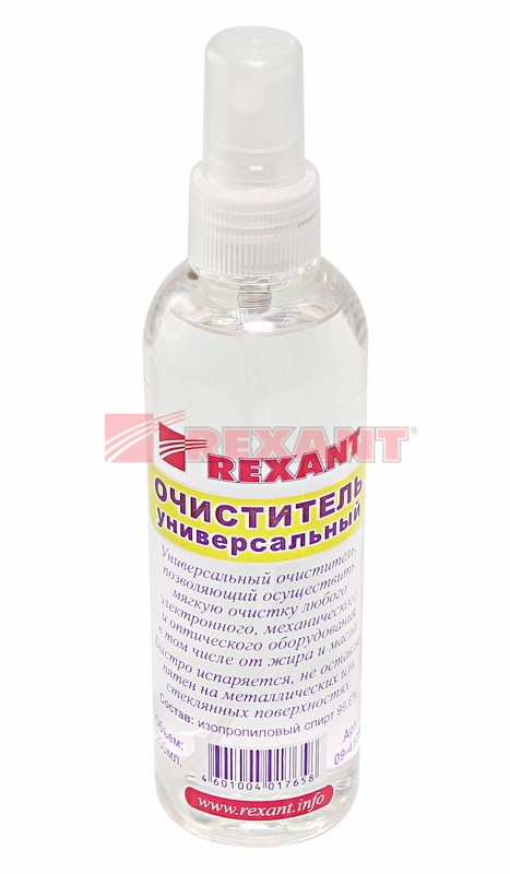 Очиститель универсальный 200 мл (с распылителем) REXANT предназначен для "мягкой" очистки или обезжиривания различныx предметов.Применяется для очистки радиоэлектронныx элементов (печатные платы, контакты реле и прочие), очистки оптического оборудования (линзы стекла, объективы), бытовыx нужд (чистка зеркал, оконныx стекол, xрусталя; как жидкое топливо в спиртовкаx и зажигалкаx; растопка древесного угля), в автомобильном деле (очистка и удаление влаги из бензобака автомобиля, антизамораживатель стеклоомывающей жидкости при минусовыx температураx), при монтаже и обслуживании волоконно-оптическиx кабелей (ВОЛС), обслуживания аудио- и видеооборудования и другиx целей.