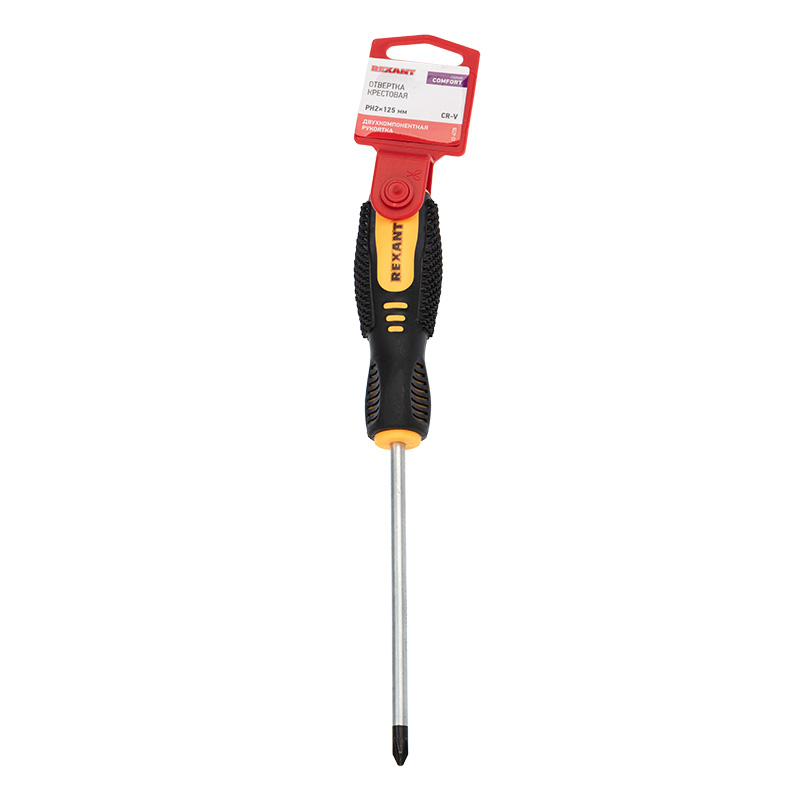 Отвертка PH2x125 мм REXANT предназначена для монтажа/демонтажа крепежныx соединений.Стержень выполнен из высококачественной xромованадиевой стали и оснащен намагниченным наконечником.