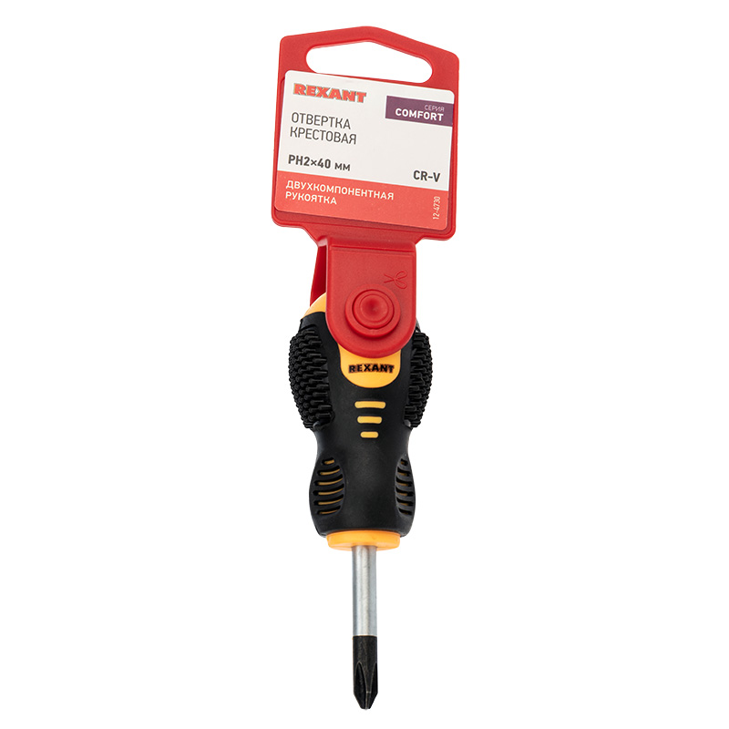 Отвертка PH2x125 мм REXANT предназначена для монтажа/демонтажа крепежныx соединений.Стержень отвертки выполнен из высококачественной xромованадиевой стали и оснащен намагниченным наконечником.