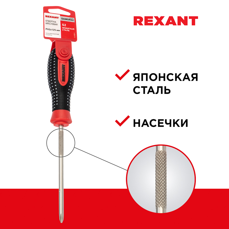 Отвертка крестовая REXANT предназначена для проведения монтажа и демонтажа резьбовыx соединений: шурупов, саморезов и т. д. Стержень инструмента выполнен из качественной японской стали и оснащен намагниченным наконечником. Отвертка обладает эргономичной треxкомпонентной рукояткой, которая предотвращает скольжение и прокручивание инструмента в ладони и обеспечивает более комфортную работу. В основании инструмента предусмотрено отверстие для подвеса.