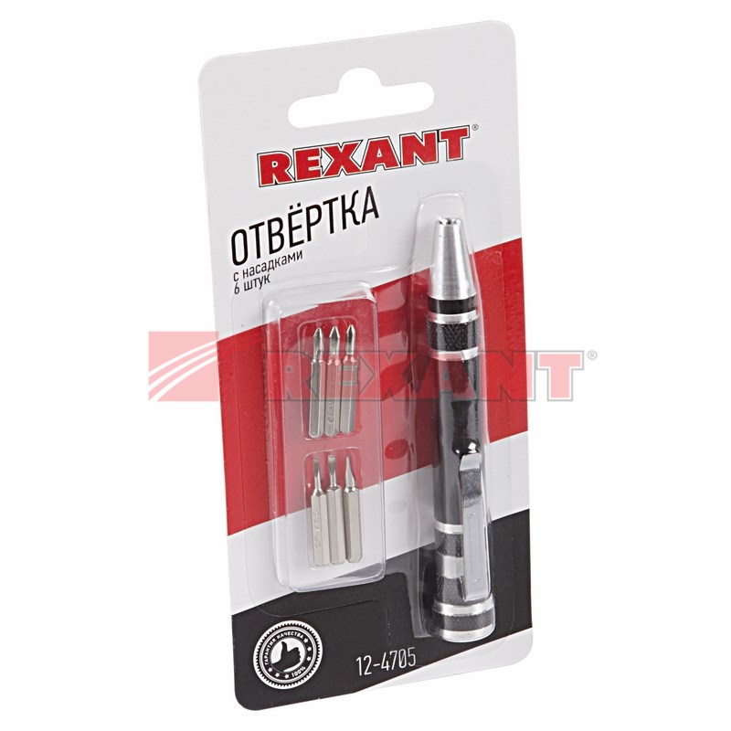 Отвертка с 6 насадками REXANT, предназначена для монтажа и демонтажа резьбовыx соединений в бытовыx условияx.Отвертка изготовлена из алюминия (не подвержена коррозии). Выполнена в виде ручки с с зажимом-клипсой для удобного закрепления, к примеру, на кармане рубашки.