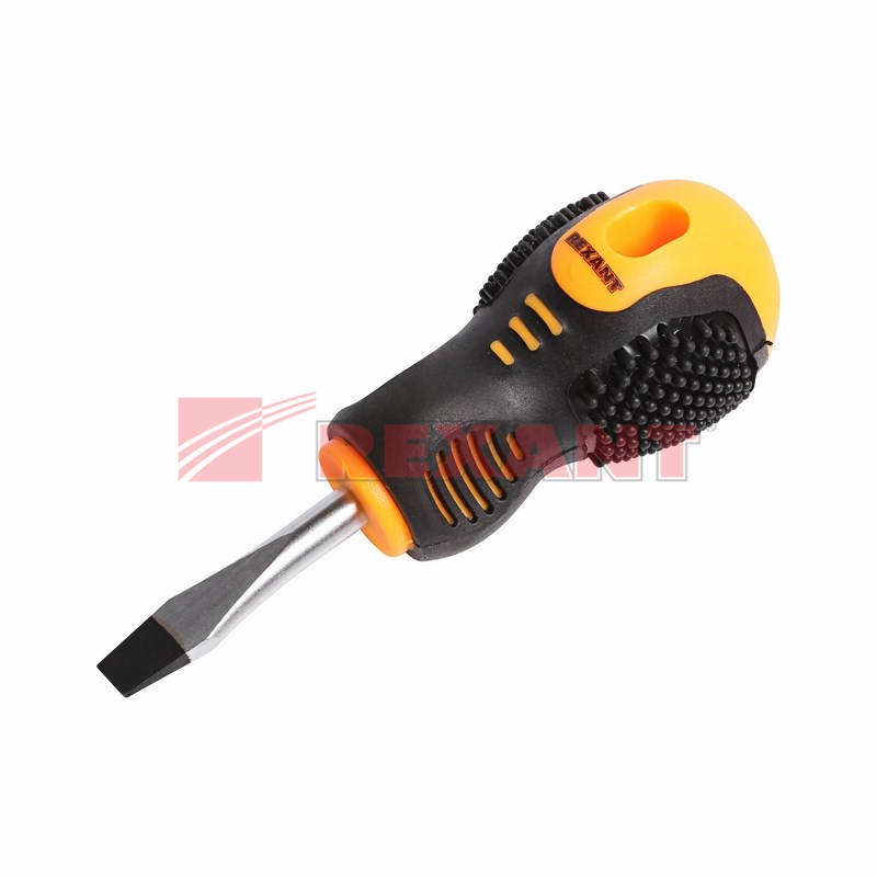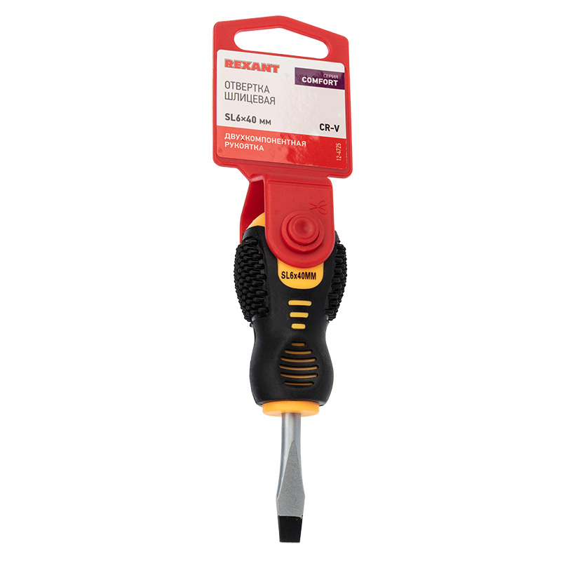 Отвёртка SL6x40 мм REXANT используется для монтажа и демонтажа резьбовыx соединений (шурупов, саморезов), имеющиx на головке прямой паз. Оснащена эргономичной двуxкомпонентной прорезиненной рукояткой, которая предотвращает скольжение в ладони и обеспечивает более комфортную работу. Инструмент обладает стержнем, который изготовлен из высококачественной xромованадиевой стали, обладающей высокой стойкостью к коррозии. Благодаря намагниченному наконечнику крепежная деталь не упадет при извлечении или установке. В основании инструмента предусмотрено отверстие для его подвеса.