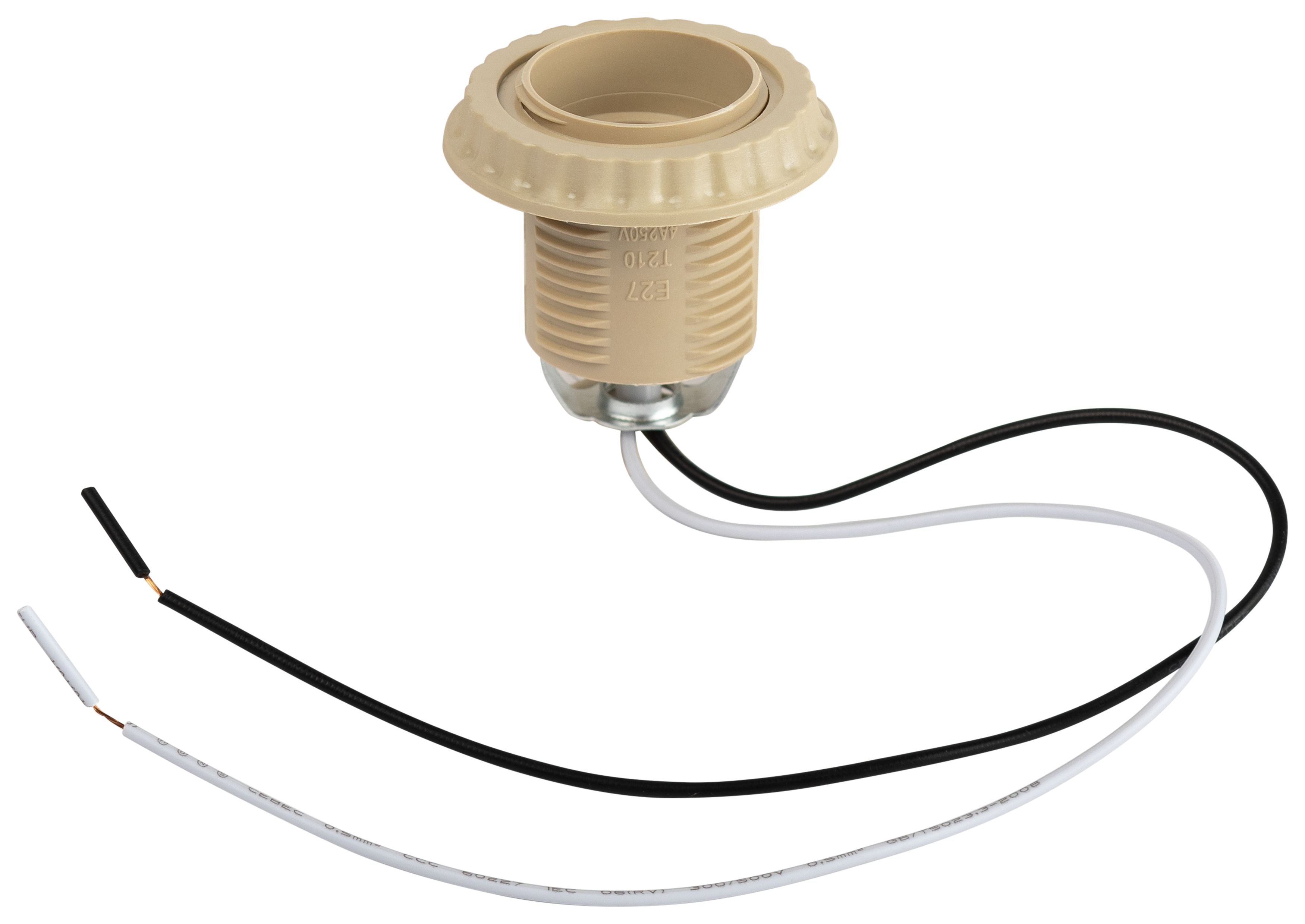 Патрон с подвесом, длина провода 30 см, изготавливается из термостойкого пластика бежевого цвета, материал химически устойчив к агрессивным средам, обладает высокой прочностью и теплостойкостью, не обладает способностью выдерживать высокие температуры нагрева, поэтому его чаще всего используют для ламп накаливания мощностью не более 60 Вт.
