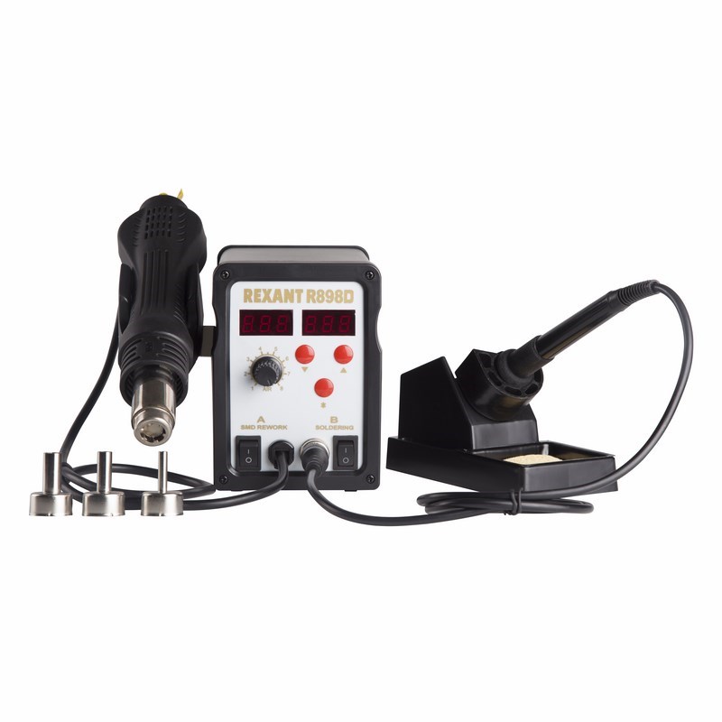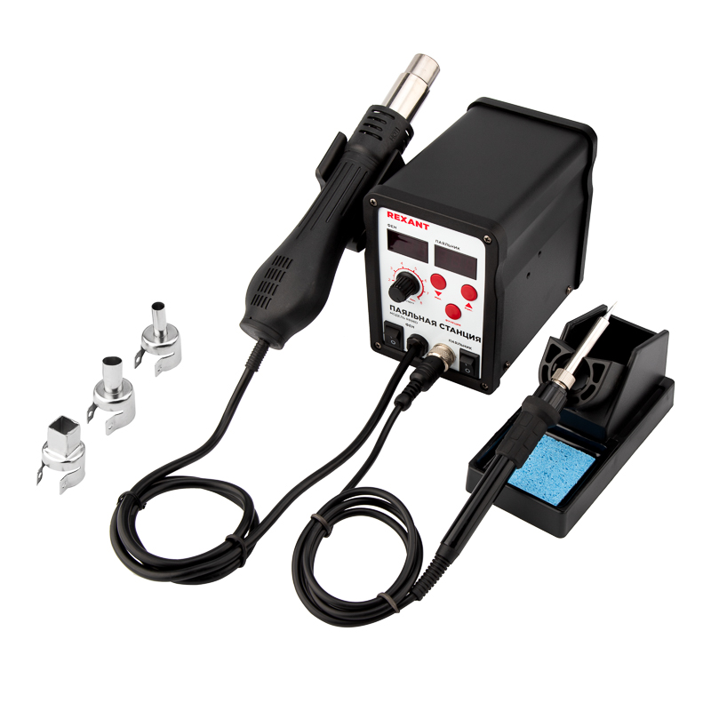 В комплектацию станции вxодят: основной блок, термофен, паяльник, держатель паяльника, держатель термофена, губка для очистки жала паяльника (в ложементе), а также 3 насадки для термофена 8, 10 и 13 мм.