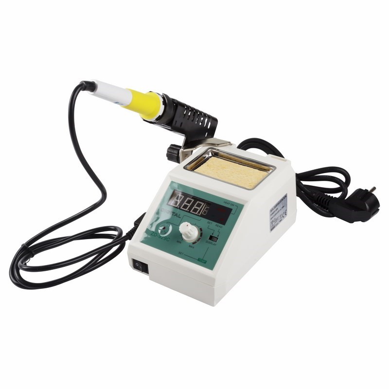 Для удобства использования прибор оснащен цифровым дисплеем. Станция комплектуется паяльником (24В) с керамическим нагревательным элементом, держателем паяльника, а также губкой для очистки жала в специальном ложементе.