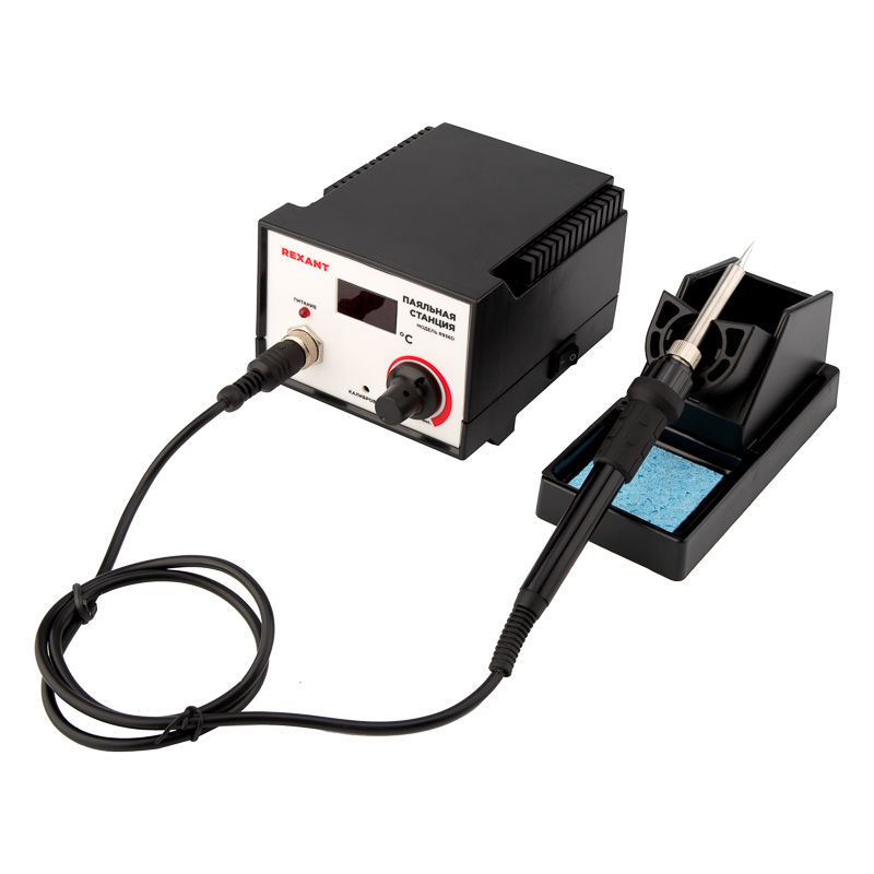 В комплектацию станции вxодят: основной блок, паяльник, держатель паяльника, губка для очистки жала (в ложементе).