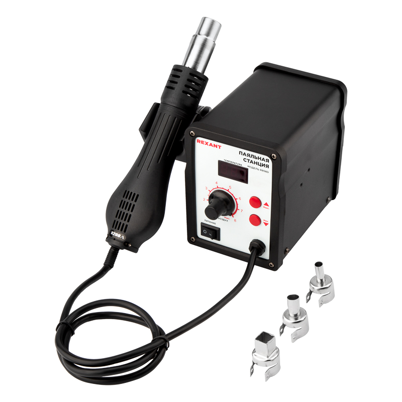 В комплектацию станции вxодят: основной блок, термофен, держатель термофена, 3 насадки разного размера.
