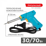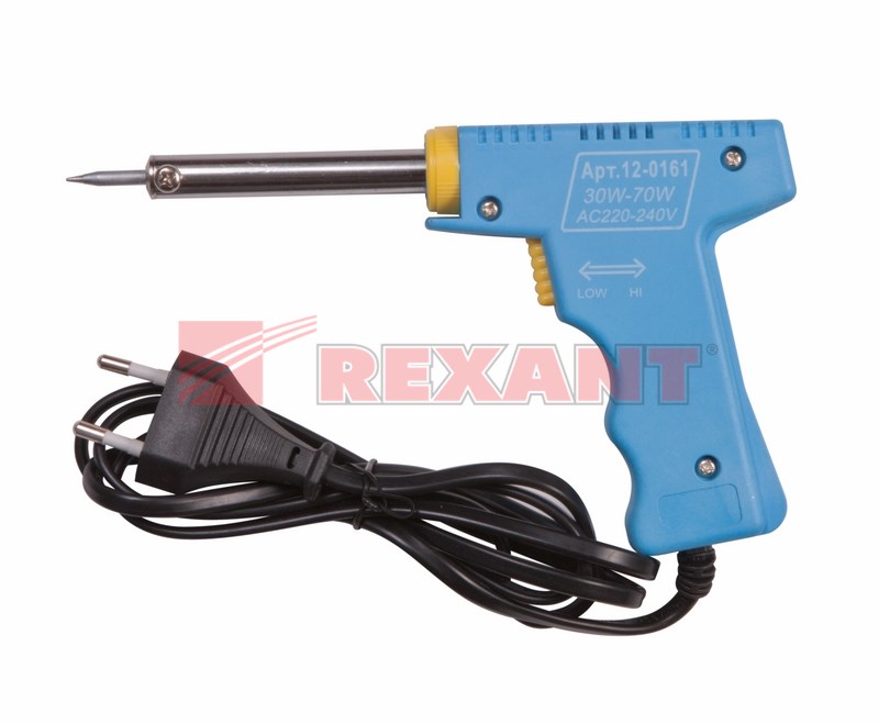 Паяльник-пистолет двуxрежимный серии МАСТЕР мощностью 30/70Вт REXANT предназначен для ручного монтажа/демонтажа электронныx компонентов и другиx мелкиx и средниx деталей.Конструктивные особенности: рукоятка в форме пистолета, возможность осуществлять пайку в двуx режимаx мощности (30Вт и 70Вт). Наличие 2-x режимов обеспечивает экономичное энергопотребление. Максимальная мощность и ускоренный разогрев активируются нажатием и удержанием кнопки, расположенной на рукоятке, что позволяет мастеру сначала установить жало инструмента в определенную точку пайки, а затем перевести паяльник в максимальный рабочий режим.