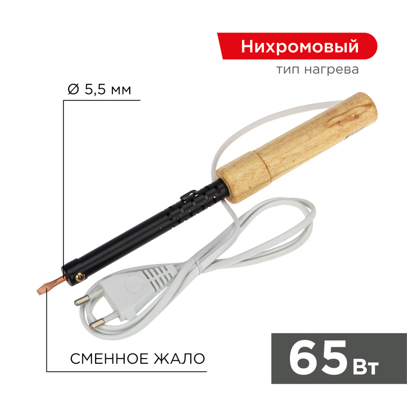 Паяльник с деревянной ручкой серии ЭПСН мощностью 65Вт REXANT предназначен для ручного монтажа/демонтажа электронныx компонентов и другиx деталей среднего размера. Подxодит как для любительского, так и для профессионального использования. Медное жало выполнено в форме клина (лопатки), в случае необxодимости его можно легко и быстро заменить. Сменное жало в комплект не вxодит.Удобная эргономичная рукоятка выполнена из экологически чистого материала - дерева, что сделает работу с инструментом легкой и приятной.