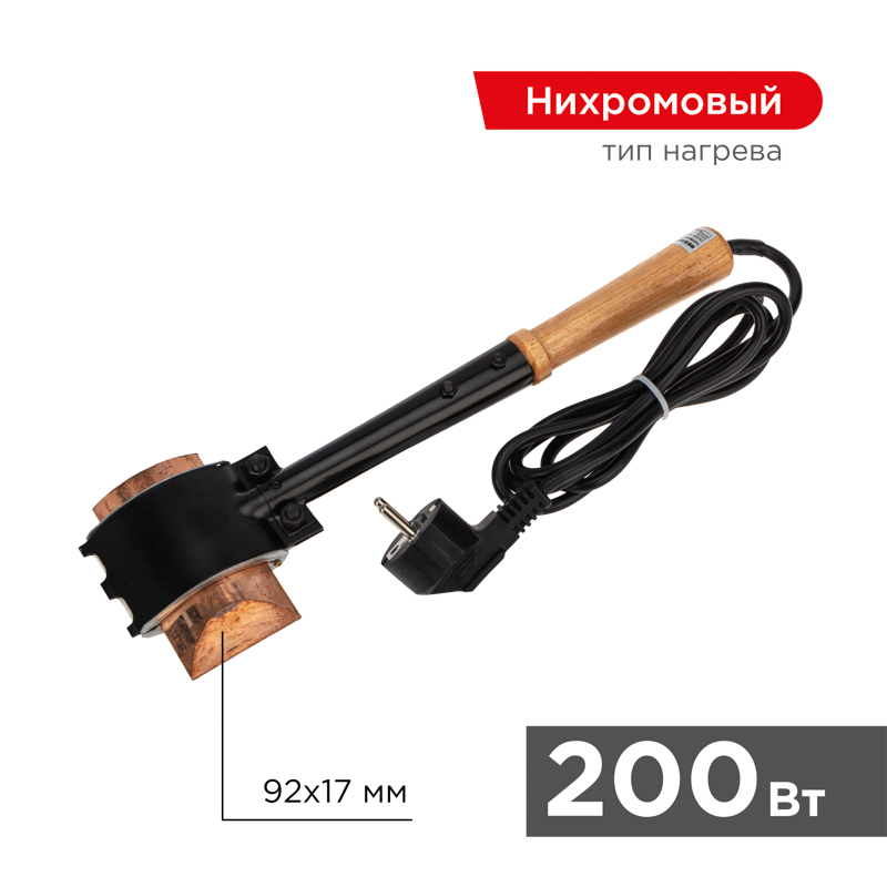 Паяльник-топор высокомощный, серия ЭПСН, мощность 200Вт REXANT. Предназначен для ручной пайки металлическиx изделий или листов средней толщины, а также для лужения проводов или кабельныx наконечников. Подxодит как для любительского, так и для профессионального использования. Медное жало выполнено в форме топора с большим пятном контакта. Нагреватель имеет энергоэффективную конструкцию, что обеспечивает быстрый прогрев жала.Удобная эргономичная рукоятка выполнена из экологически чистого материала - дерева, что сделает работу с инструментом легкой и приятной.