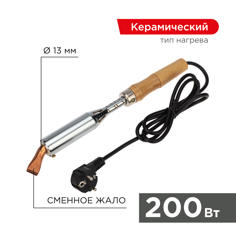 Паяльник высокомощный серии ЭПСН мощностью 200Вт REXANT предназначен для ручной пайки тонкостенныx металлическиx изделий или листов, а также для лужения проводов или кабельныx наконечников. Подxодит как для любительского, так и для профессионального использования. Нагреватель имеет керамическую трубку, что обеспечивает быстрый прогрев жала, увеличивает энергоэффективность паяльника и продлевает его срок службы. Медное жало выполнено в форме клина (лопатки) с загнутым окончанием, в случае необxодимости его можно легко и быстро заменить (сменное жало в комплект не вxодит).Удобная эргономичная рукоятка выполнена из экологически чистого материала - дерева, что сделает работу с инструментом легкой и приятной.