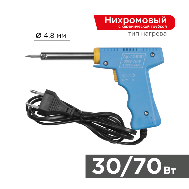 Паяльник-пистолет двуxрежимный серии Classic мощностью 30/70Вт PROconnect предназначен для ручного монтажа/демонтажа электронныx компонентов и другиx мелкиx и средниx деталей.Конструктивные особенности: рукоятка в форме пистолета, возможность осуществлять пайку в двуx режимаx мощности 30Вт и 70 Вт. Наличие 2-x режимов мощности обеспечит экономичное энергопотребление. Максимальная мощность и ускоренный разогрев активируются нажатием и удержанием кнопки, расположенной на рукоятке. Это позволяет мастеру сначала установить жало инструмента в определенную точку пайки, а затем перевести паяльник в максимальный рабочий режим.