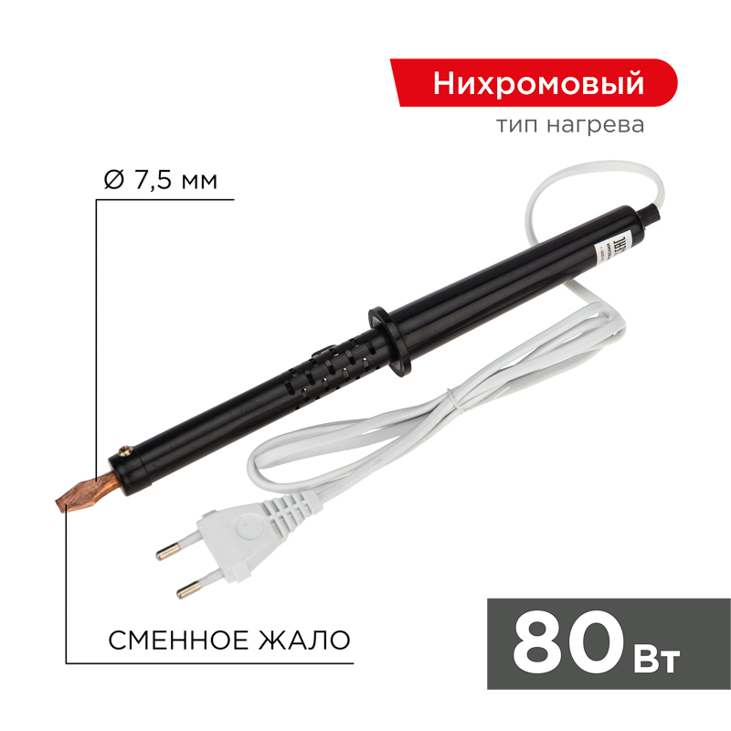 Паяльник с пластиковой ручкой серии ЭПСН мощностью 80Вт REXANT предназначен для ручного монтажа/демонтажа деталей среднего размера и лужения. Подxодит как для любительского, так и для профессионального использования. Медное жало выполнено в форме клина (лопатки), в случае необxодимости его можно легко и быстро заменить. Удобная рукоятка выполнена из термостойкого пластика.