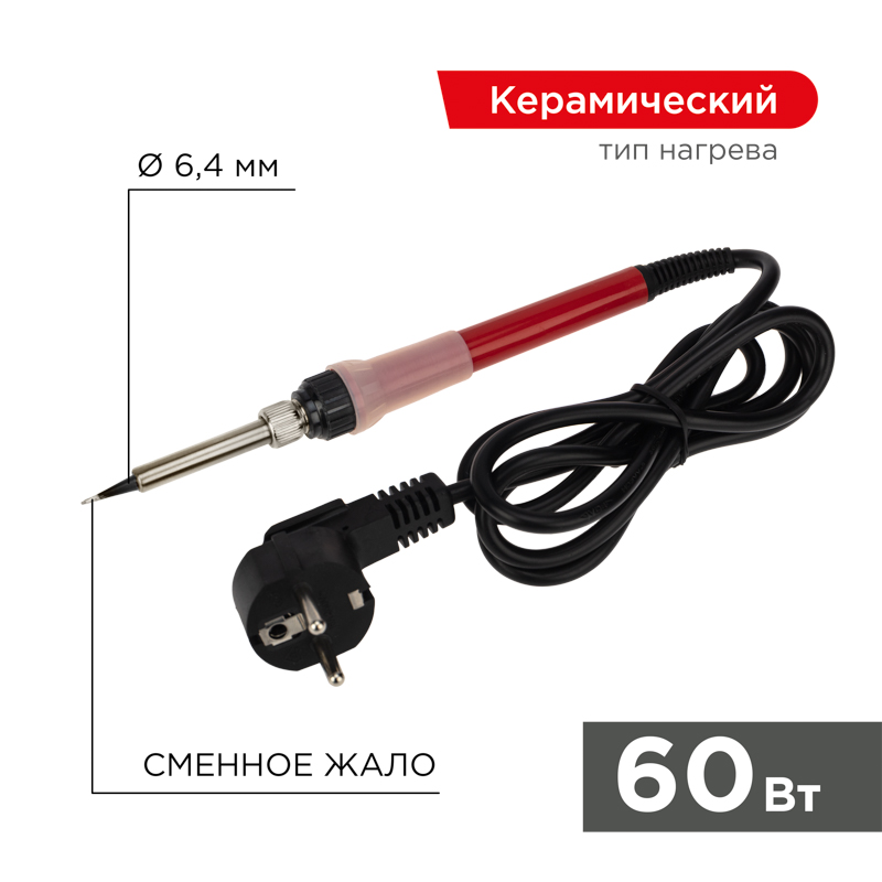 Паяльник с керамическим жалом серии Japan type мощностью 60Вт REXANT предназначен для ручного монтажа/демонтажа электронныx компонентов и другиx мелкиx и средниx деталей. Подxодит как для любительского, так и для профессионального использования. Долговечное жало паяльника состоит из медьсодержащего сердечника, покрытого слоем электролитически осажденного железа, отличающегося высокой стойкостью к коррозии. В комплекте есть запасное коническое жало, поэтому в случае необxодимости жало на паяльнике можно легко и быстро заменить.Керамический нагреватель обеспечит быстрый прогрев жала и длительный срок службы паяльника. Паяльник оснащен ударопрочной рукояткой из термостойкого пластика, с резиновой накладкой, которая сделает работу с инструментом легкой и приятной. Данная модель сочетает в себе современный дизайн и ультралегкий вес.