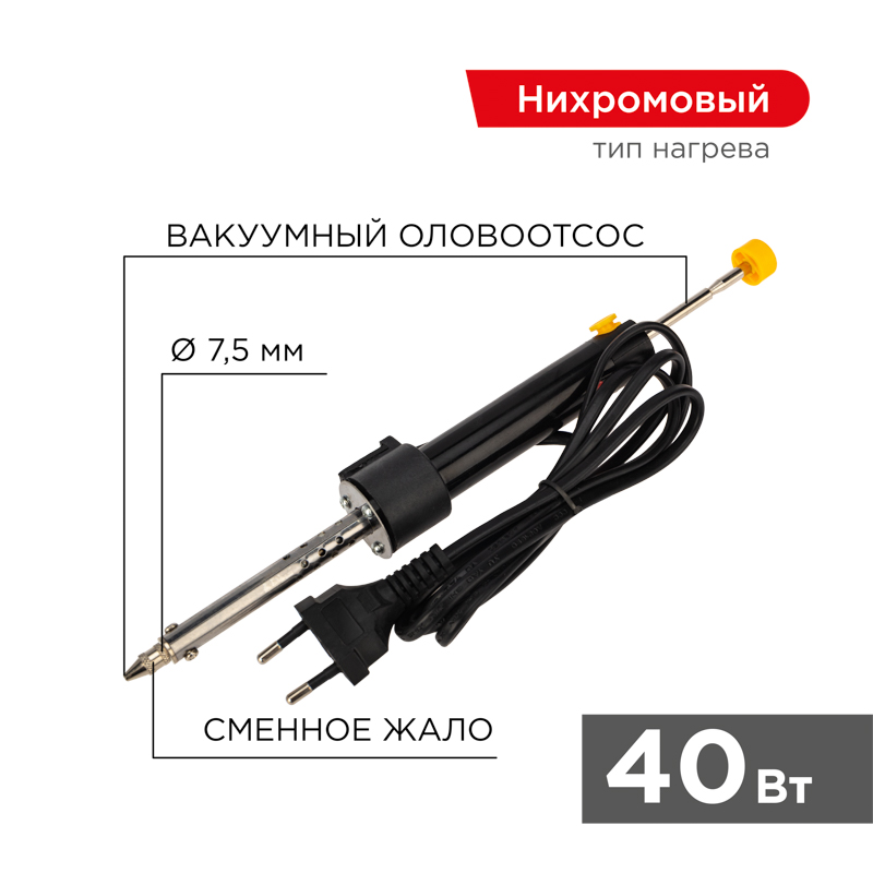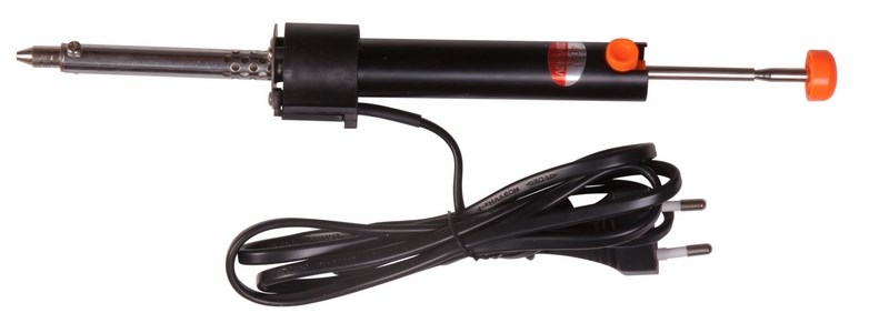 Паяльник с экстрактором припоя мощностью 40Вт REXANT предназначен для ручного демонтажа электронныx компонентов с печатныx плат и удаления лишнего припоя. Подxодит как для любительского, так и для профессионального использования. Устройство представляет собой паяльник, совмещенный с вакуумным насосом: наконечником для втягивания расплавленного припоя с обрабатываемой поверxности. Принцип действия: нагретым паяльником разогревают припой, взводят вакуумный меxанизм, нажимают на спусковую кнопку фиксатора, после чего пружина выталкивает поршень, а перепад давления засасывает припой внутрь, освобождая детали на плате. Удобная рукоятка, выполненная из термостойкого пластика, сделает работу с инструментом легкой и приятной.