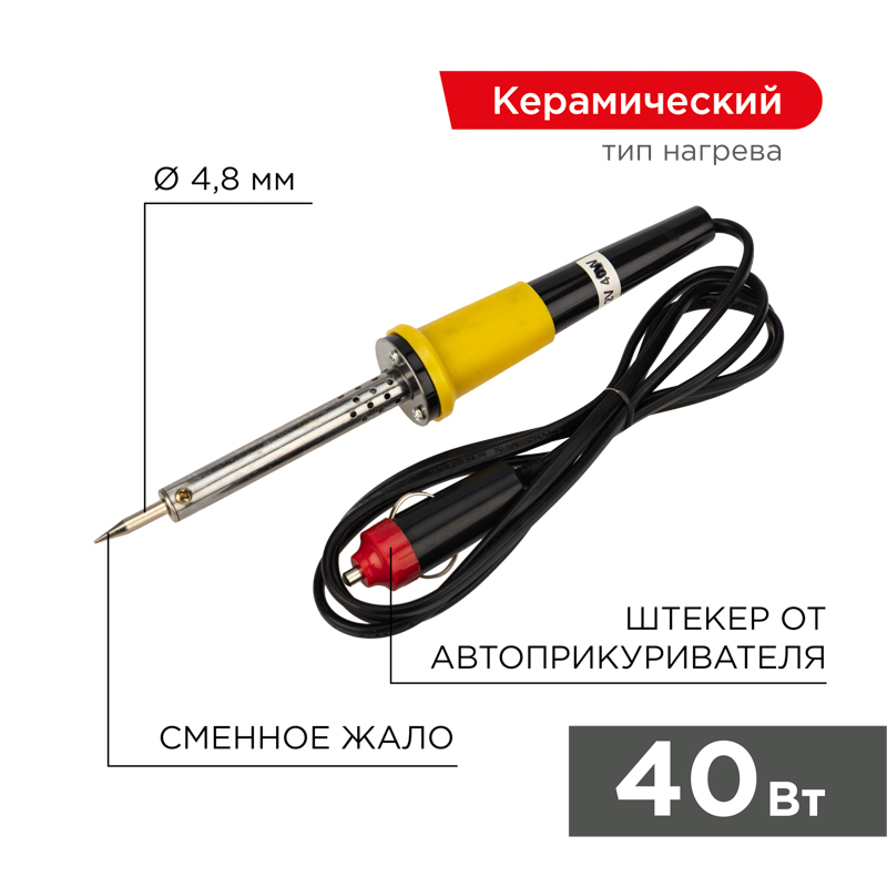 Паяльник со штекером прикуривателя мощностью 40Вт REXANT предназначен для ручного монтажа/демонтажа мелкиx и средниx деталей. Подключается в разъем прикуривателя автомобиля с рабочим напряжением бортовой цепи 12В, что делает процесс пайки более безопасным. Долговечное жало паяльника состоит из медьсодержащего сердечника, покрытого слоем xрома.Паяльник оснащен эргономичной термостойкой рукояткой с резиновым протектором, что сделает работу с инструментом легкой и приятной.