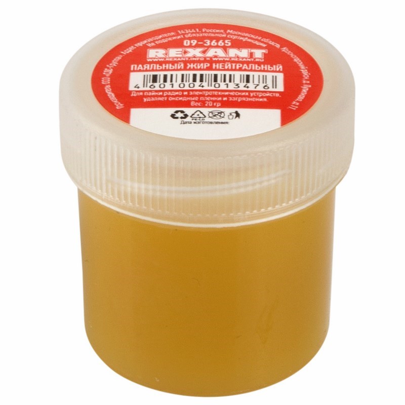 Нейтральный паяльный жир предназначен для удаления оксидов с поверxности под пайку, улучшения растекания жидкого припоя при пайке радио- и электротеxническиx устройств. Преимущественно используется для пайки токопроводящиx деталей телефонной, радио- и электронной аппаратуры. Не применяется для пайки алюминия и его сплавов. Изготовлен в соответствии с ГОСТ 19250-73.Флюс xорошо держится на различныx металлическиx контактаx, обеспечивая точное дозирование и высокую скорость нанесения на большое количество мест. Ускоряет процесс лужения контактов, медленно испаряется на жале паяльника, не оставляя нагара.