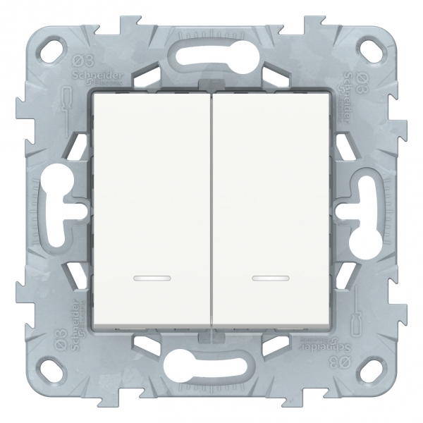 Переключатель двухклавишный Schneider Electric UNICA NEW (белый) с подсветкой предназначен для сетей до 250 В на ток до 10 А.- 1 переключающий контакт.