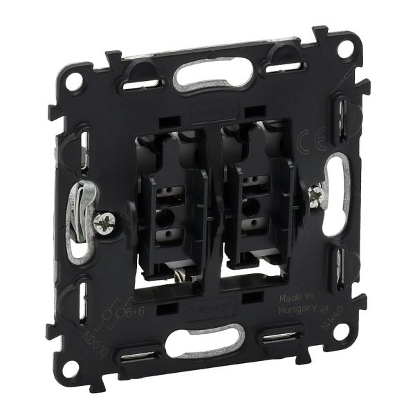 Двухклавишный переключатель Valena In’Matic для управления двумя независимыми линиями освещения или группами нагрузки. Безвинтовые зажимы ускоряют монтаж, а механизм подходит для установки в жилых, офисных и гостиничных интерьерах с последующим подбором декоративной отделки серии.