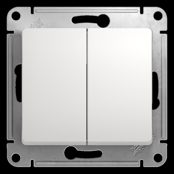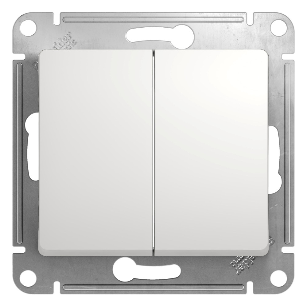 Механизм Systeme Electric (ранее Schneider Electric) серии Glossa (цвет белый) переключателя 2-клавишного подходит для сетей 250 В, на ток 10 А. Переключатель позволяет управлять одним источником света с двух точек. Выполнен из материала PС+ASA, стойкого к УФ-излучению и появлению царапин. Эргономичные клеммы расположены в два ряда: сверху и снизу.
