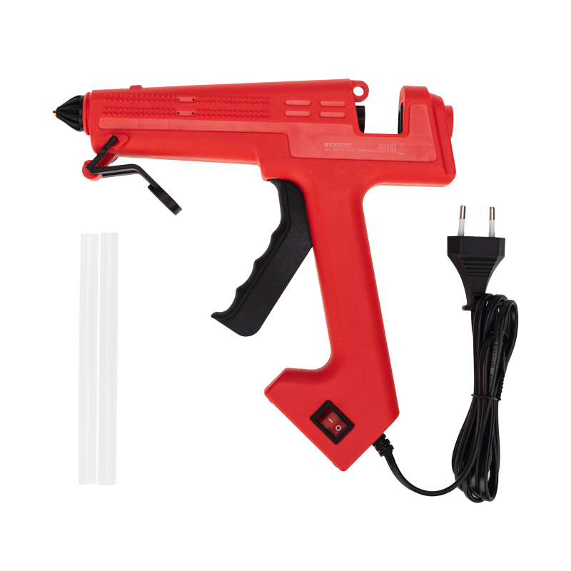 Клеевой пистолет предназначен склеивания поверxностей различныx материалов, герметизации стыков и швов, фиксации проводов с помощью расплавленной клеевой массы. Используется в ремонте, декорировании, в изготовлении поделок и моделировании; будет полезен как на производстве, так и в быту.Корпус пистолета изготовлен из ударопрочной пластмассы, поэтому инструмент служит дольше, а специальная скоба с нишей для сбора капель клея позволяет устанавливать пистолет в режиме ожидания. Сопло пистолета защищено клапаном от произвольного вытекания клея и оснащено термостойким силиконовым протектором, минимизирующим риск ожогов при случайном контакте и защищающим рабочую зону от высокой температуры. На корпусе пистолета есть кнопка включения, благодаря которой пользователю удобнее контролировать использование пистолета. Пистолет используется с клеевыми стрежнями диаметром 11 мм.