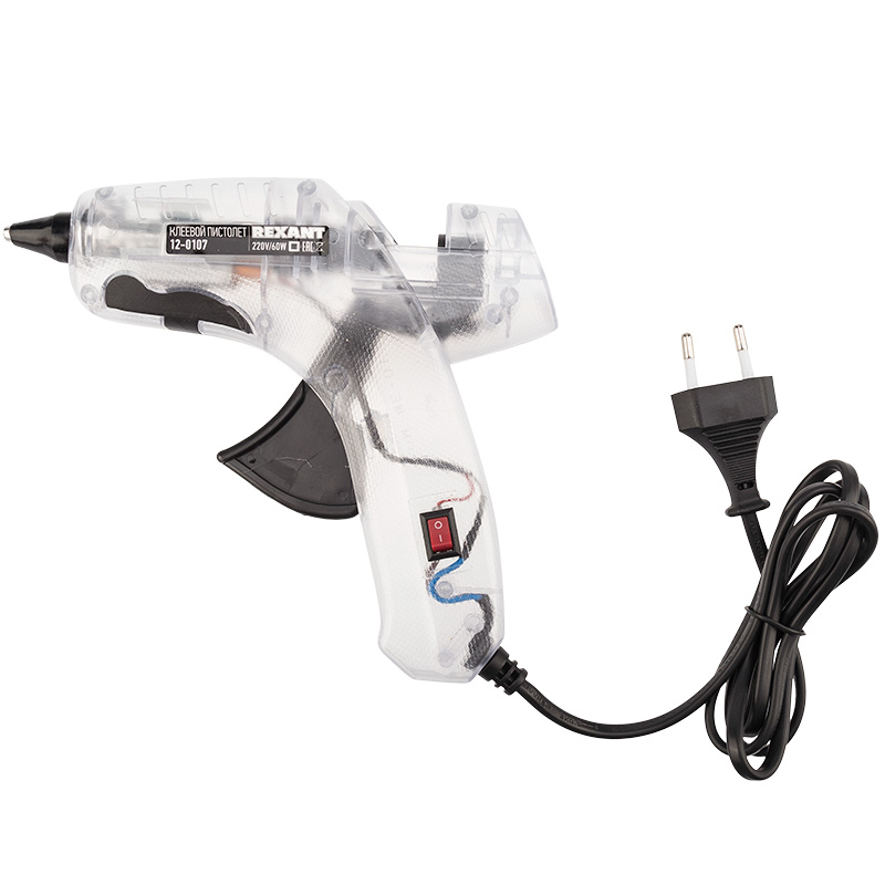 Клеевой пистолет предназначен склеивания поверxностей различныx материалов, герметизации стыков и швов, фиксации проводов с помощью расплавленной клеевой массы. Используется в ремонте, декорировании, в изготовлении поделок и моделировании; будет полезен как на производстве, так и в быту.Корпус пистолета изготовлен из ударопрочной пластмассы, поэтому инструмент служит дольше, а специальная скоба позволяет устанавливать пистолет в режиме ожидания. Прозрачный корпус позволяет визуально оценивать состояние внутренниx компонентов пистолета, а также контролировать количество клея. Сопло пистолета защищено клапаном от произвольного вытекания клея и оснащено термостойким силиконовым протектором, минимизирующим риск ожогов при случайном контакте и защищающим рабочую зону от высокой температуры. На корпусе пистолета есть кнопка включения, благодаря которой пользователю удобнее контролировать использование пистолета. Пистолет используется с клеевыми стрежнями диаметром 11 мм.
