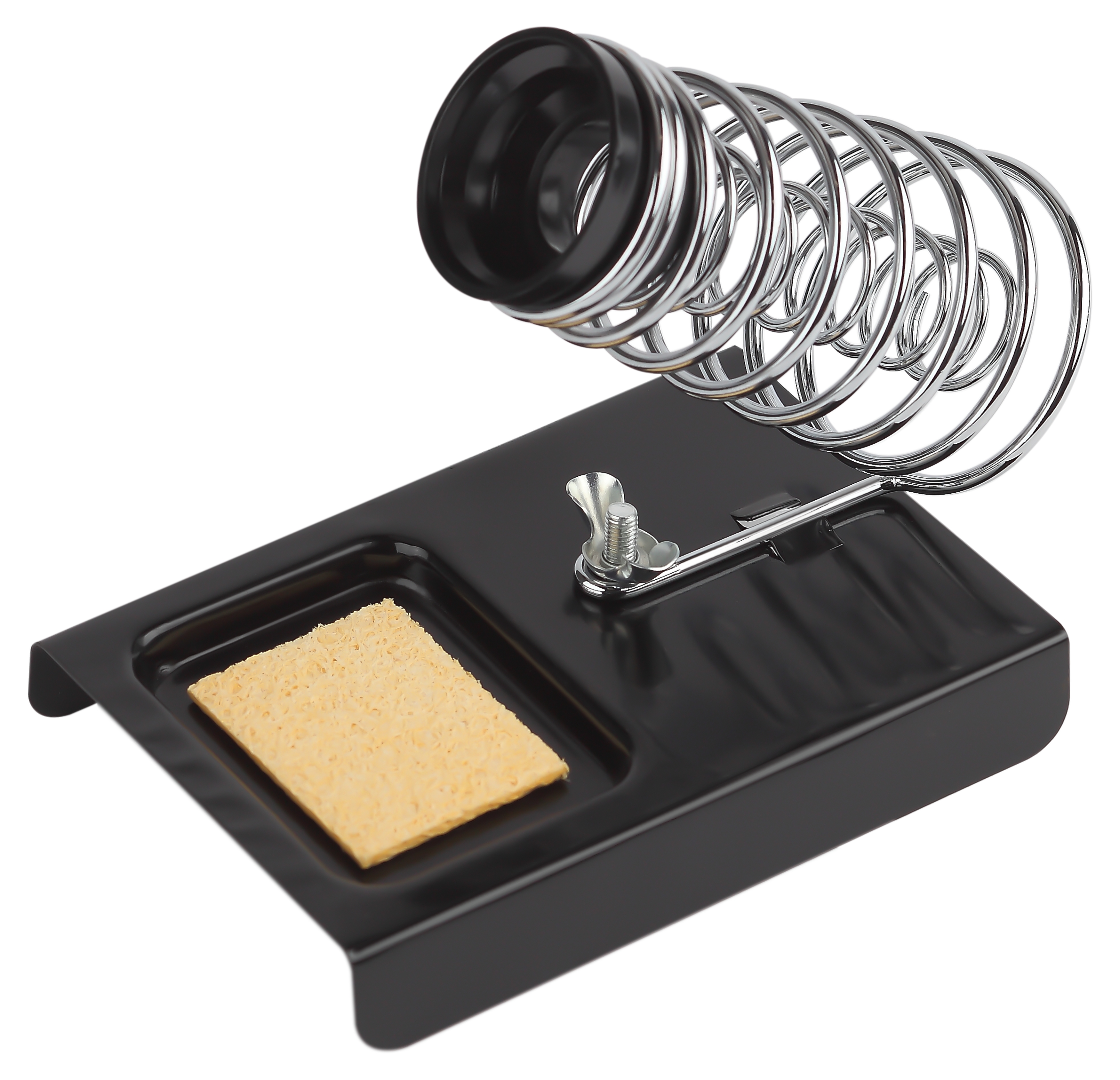Подставка под паяльник Применяется для хранения паяльника вовремя его нагрева и в перерывах между работой.Паяльник легко и удобно умещается в направляющую закреплённую на устойчивой штампованной платформе с ложементом под губку. Губка для очистки жала от припоя идёт в комплекте.