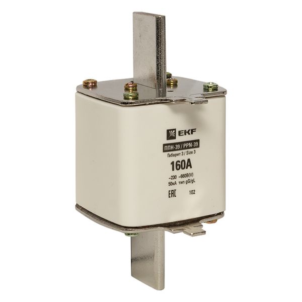 Плавкая вставка ППН-39 630/160А габарит 3 EKF. Предохранители плавкие ППН EKF, укомплектованные плавкими вставками типа gG/gL, предназначаются для защиты кабельных линий и промышленных электроустановок от токов перегрузки и короткого замыкания. Предохранители применяются в электрических сетях переменного тока частотой 50 Гц с напряжением до 660В. Применяются для крепления в распределительных и вводно-распределительных устройствах. Предохранители плавкие ППН могут устанавливаться в основание с держателем, а также в специально предназначенные рубильники. В комплект поставки предохранителей плавких ППН основание с держателем не входит и приобретается отдельно.