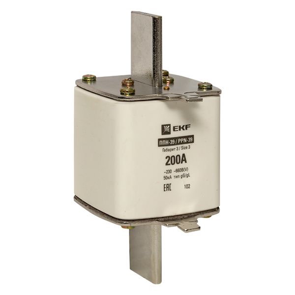 Плавкая вставка ППН-39 630/200А габарит 3 EKF. Предохранители плавкие ППН EKF, укомплектованные плавкими вставками типа gG/gL, предназначаются для защиты кабельных линий и промышленных электроустановок от токов перегрузки и короткого замыкания. Предохранители применяются в электрических сетях переменного тока частотой 50 Гц с напряжением до 660В. Применяются для крепления в распределительных и вводно-распределительных устройствах. Предохранители плавкие ППН могут устанавливаться в основание с держателем, а также в специально предназначенные рубильники. В комплект поставки предохранителей плавких ППН основание с держателем не входит и приобретается отдельно.