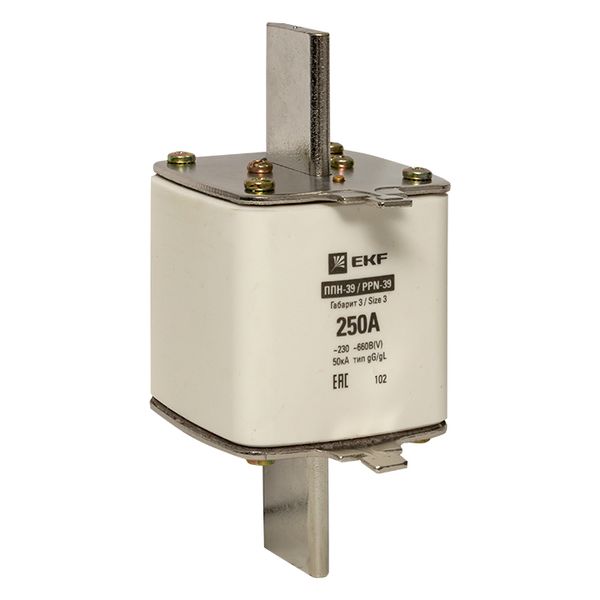 Плавкая вставка ППН-39 630/250А габарит 3 EKF. Предохранители плавкие ППН EKF, укомплектованные плавкими вставками типа gG/gL, предназначаются для защиты кабельных линий и промышленных электроустановок от токов перегрузки и короткого замыкания. Предохранители применяются в электрических сетях переменного тока частотой 50 Гц с напряжением до 660В. Применяются для крепления в распределительных и вводно-распределительных устройствах. Предохранители плавкие ППН могут устанавливаться в основание с держателем, а также в специально предназначенные рубильники. В комплект поставки предохранителей плавких ППН основание с держателем не входит и приобретается отдельно.