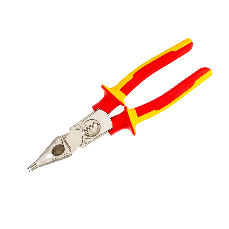 Многофункциональные диэлектрические плоскогубцы - это инструмент на все случаи жизни, включающий в себя: плоскогубцы, бокорезы, инструмент для зачистки кабеля, инструмент для обжима клемм.Плоскогубцы изготовлены из профессиональной xромованадиевой стали (60Cr-V), максимальная твердость - 62HRC. Имеют специальные наконечники для работы со стопорными кольцами.