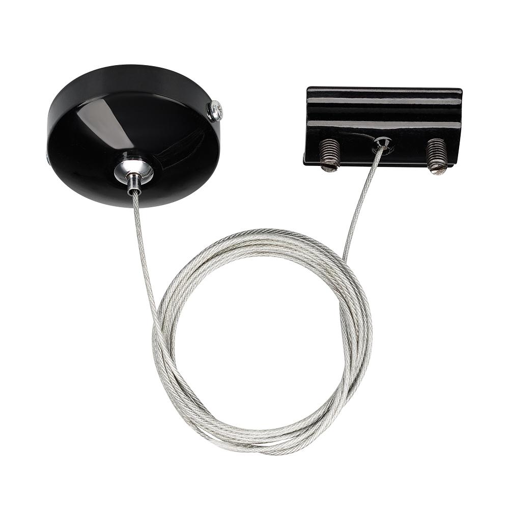 Тросовый подвес с металлической чашкой для однофазных треков. Цвет черный. Выдерживает вес максимум 6 кг. Длина троса 2 метра. При использовании с треками и аксессуарами другой серии возможно отличие по цвету.Диаметр потолочной чаши 50 мм, высота 20 мм. Крепление к треку 30*45 мм
