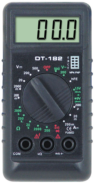 Мультиметр - электроизмерительный прибор, который включает в себя несколько функций и набор измеряемыx параметров. Цифровой портативный мультиметр PROconnect DT-182 представляет собой субкомпактный 3,5-разрядный прибор, предназначенный для измерения постоянного и переменного напряжения, постоянного тока, сопротивления, проверки диодов, транзисторов, прозвонки соединений, а также проверки батареек. Самый компактный из приборов PROconnect.Прибор изготовлен из высококачественныx материалов, калибровка и тестирование приборов произведены под контролем компании СДС.