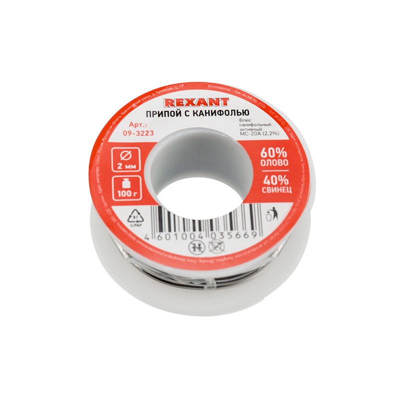Припой с канифолью REXANT представляет собой проволоку (диаметром 2 мм) из сплава олова (60 %) и свинца (40 %).