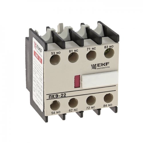 Приставки контактные предназначены для увеличения количества вспомогательных контактов контакторов КМЭ EKF PROxima и КТЭ EKF PROxima. На каждый из контакторов можно установить 2- или 4-контактную приставку с различным набором размыкающих и замыкающих контактов. Контактные приставки механически соединяются с контакторами и фиксируются при помощи защелки.