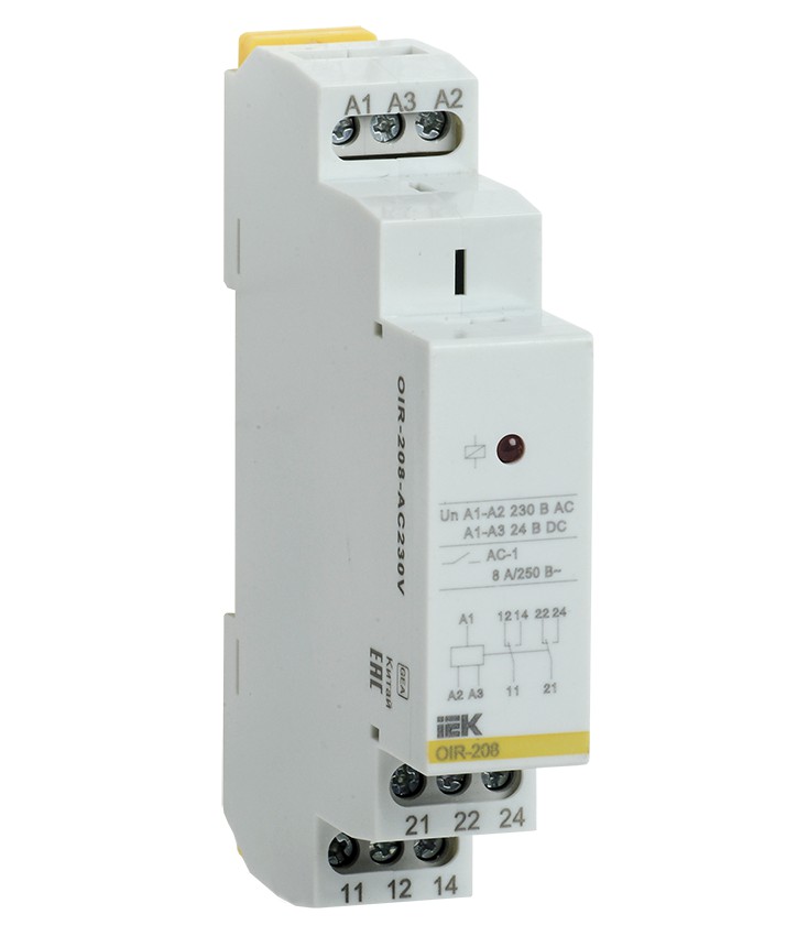 Предназначено для гальванической развязки и передачи команд управления исполнительным элементам, между силовыми цепями и цепями управления.Три контактных группы, с коммутационной возможностью до 8А каждая. Номинальное напряжение катушки реле 230В AC.