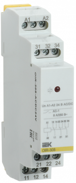 Предназначено для гальванической развязки и передачи команд управления исполнительным элементам, между силовыми цепями и цепями управления.Три контактных группы, с коммутационной возможностью до 8А каждая. Номинальное напряжение катушки реле 24В AC/DC.