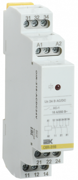 Предназначено для гальванической развязки и передачи команд управления исполнительным элементам, между силовыми цепями и цепями управления.Три контактных группы, с коммутационной возможностью до 16А каждая. Номинальное напряжение катушки реле 24В AC/DC.