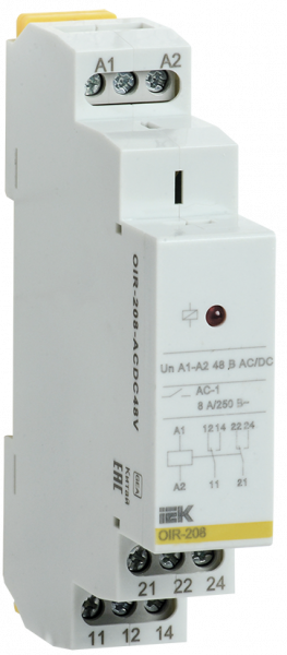 Предназначено для гальванической развязки и передачи команд управления исполнительным элементам, между силовыми цепями и цепями управления.Две контактных группы, с коммутационной возможностью до 8А каждая. Номинальное напряжение катушки реле 48В AC/DC.