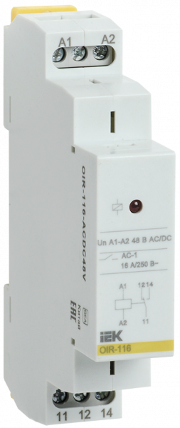 Предназначено для гальванической развязки и передачи команд управления исполнительным элементам, между силовыми цепями и цепями управления.Одна контактная группа, с коммутационной возможностью до 16А. Номинальное напряжение катушки реле 48В AC/DC.