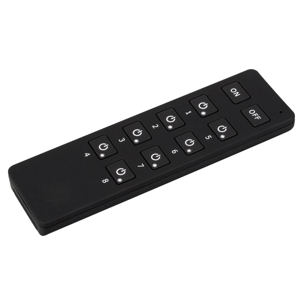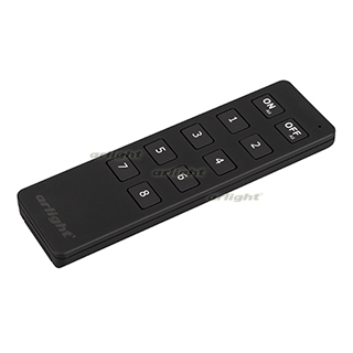 Кнопочный радиопульт 2.4 ГГц черного цвета для управления одноцветным (DIM) источником света. 8 зон управления, управление яркостью с помощью кнопок. Питание 3VDC (CR2032). Габариты 135x40x11 мм. Управляет контроллерами и панелями серии SMART (поставляются отдельно). Настенный держатель пульта в комплекте.